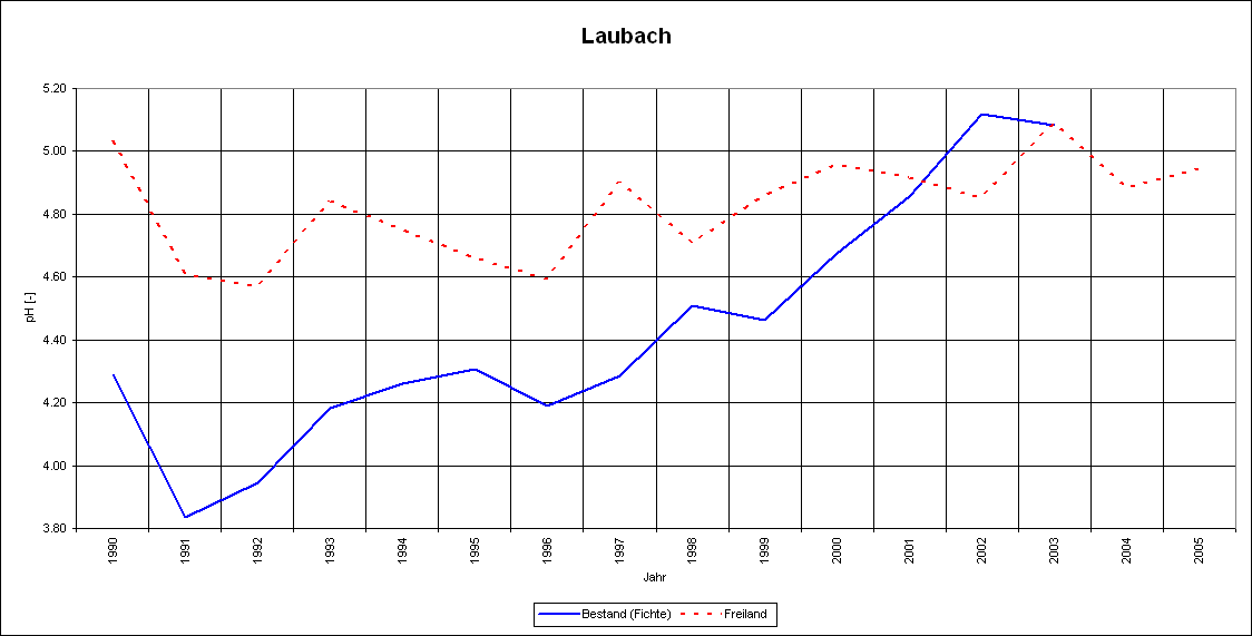 pH-Werte (Jahresmittel) im Freilandniederschlag (gestrichelte rote Linie) und im Kronendurchlass unter Fichte (durchgezogene blaue Linie)