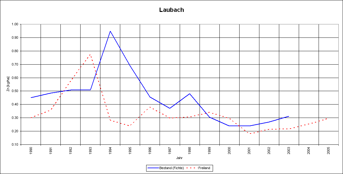 Zinkdeposition mit dem Freilandniederschlag (gestrichelte rote Linie) und mit dem Kronendurchlass (Bestandesniederschlag) unter Fichte (durchgezogene blaue Linie).