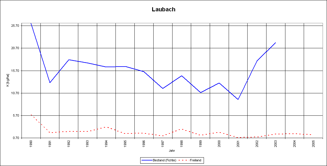 Kaliumdeposition mit dem Freilandniederschlag (gestrichelte rote Linie) und mit dem Kronendurchlass (Bestandesniederschlag) unter Fichte (durchgezogene blaue Linie).