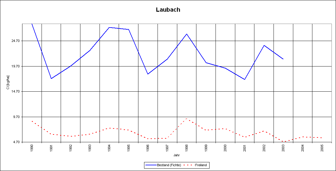 Chloriddeposition mit dem Freilandniederschlag (gestrichelte rote Linie) und mit dem Kronendurchlass (Bestandesniederschlag) unter Fichte (durchgezogene blaue Linie).